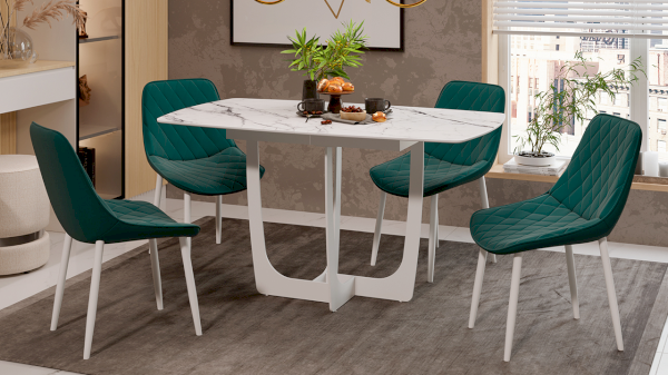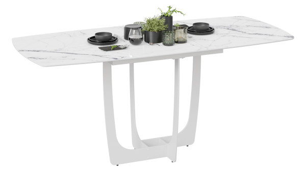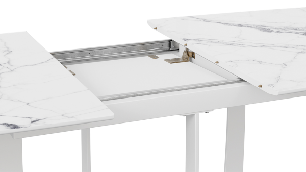 Разнообразие актуальных цветовых исполнений позволяет приобрести модель исходя из индивидуальных предпочтений каждого потребителя, подобрав мебель на любой вкус и цвет. Новинка представлена в декорах с глянцевой белой и черной столешницей, с рисунком «под мрамор», которые воплощают роскошь современных модных тенденций, а столешница со стеклом «оникс» выражает благородство и безупречность. Вставка изготовлена со стеклом, на которой продолжается рисунок декора, что позволяет столу не терять эстетической окраски даже в разложенном варианте, делая образ изделия целостным и завершенным.