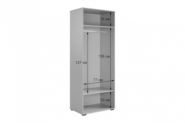 Шкаф оснащён длинными пластиковыми ручками и имеет удобное внутреннее наполнение: две большие полки и одна длинная штанга. Это позволяет рационально использовать пространство и разместить различные типы одежды.