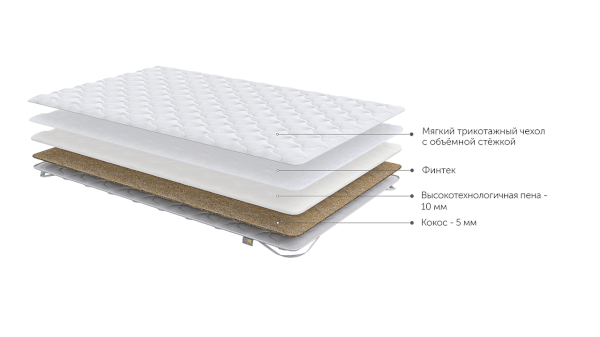 Материал на пласти топпера – трикотаж, стеганый на полиэфирном волокне. Мягкий, приятный на ощупь и уютный, улучшает воздухообмен, клиенту комфортно спать в течение всей ночи. Fintek – это надежный и прочный наполнитель, который имеет особую жесткость, благодаря чему формы матраса-топпера будут сохраняться в течение длительного срока эксплуатации. Преимущества: высокая восстанавливаемость, улучшенная прочность, превосходная надежность, повышенная устойчивость. Высокотехнологичная пена - искусственный гипоаллергенный материал с высокой плотностью. Он устойчив к высоким нагрузкам и хорошо поддерживает позвоночник.