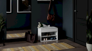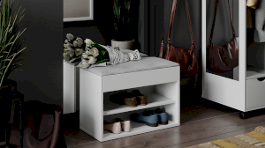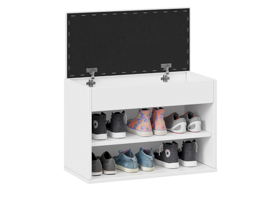 Тумба для обуви имеет открытую нишу для бережного хранения обуви и место под откидной крышкой. Данное пространство можно использовать для хранения обувных аксессуаров и различных мелочей, что без сомнений является преимуществом новинки.