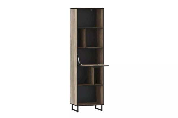 Стеллаж из коллекции ФОЛК легко впишется в интерьер гостиной в стиле Лофт, придав ей современный и монументальный вид. Черная лаконичная ручка и металлические опоры подчеркивают оригинальный дизайн мебели, а черная кромка эффектно выделяет фасад изделия.