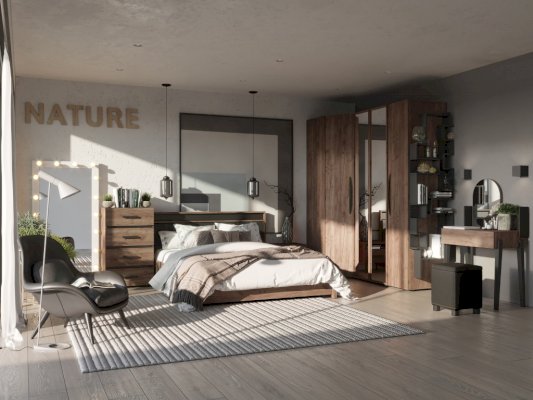 Двуспальная кровать NATURE Люкс станет стильным дополнением для вашей спальни. Спокойный древесный декор кровати поможет создать атмосферу настоящего уюта и комфорта в комнате. А контрастные вставки из ЛДСП и декоративные золотые нити на черной экокоже сделают изголовье кровати более интересным и современным. Экокожа очень легко чистится и не выгорает под воздействием солнечных лучей. Для кровати можно докупить Основание универсальное с подъемным механизмом, тем самым скомплектовать кровать с вместительным дополнительным местом для хранения. Подъемные кровати позволяют экономно использовать пространство вашей спальни, а специальный механизм подъема с газлифтами - легко пользоваться отделением для хранения.